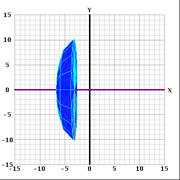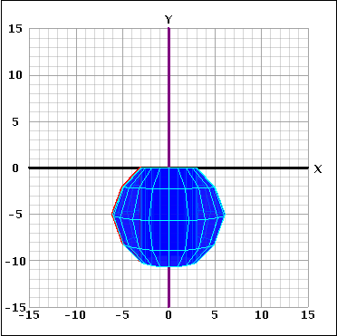This applet is 3D because of the added revolve function, which allows the user to revolve a 2-dimensional polygon through the z-plane around a chosen line on the x-y coordinate. Unlike rotating the polygon, the revolve button allows the user to see how the polygon would look if it were spinning around an axis in 3-dimensional space. By clicking on the graph and dragging it around, the user can get a much better sense of the shape of the 3-dimensional object. The same polygon as above reflected over the y-axis looks like this: