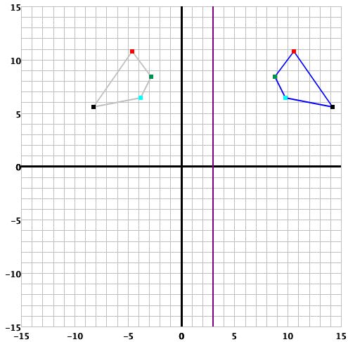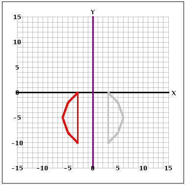 The user can also reflect the figure across a vertical line using the equation x = ? where the user fills in any integer that keeps the reflected image on the graph. An example of a polygon reflected over the line x = 0 is presented here: