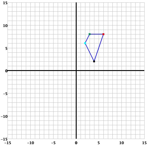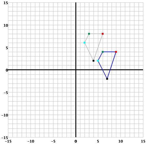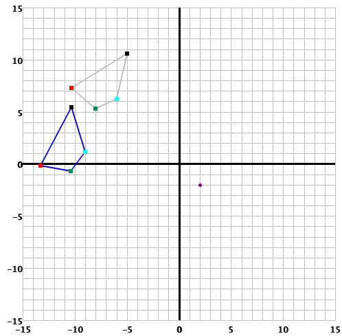 - Each vertex of the polygon is colored a different color to help you see the orientation of the polygon. Whenever you perform a translation, reflection, or rotation the polygon is redrawn in its new position and orientation, and a "ghost" polygon is drawn in gray in the previous position. This will help you remember where the polygon was before the transformation. You can also manipulate the perspective of the graph by dragging the graph with your mouse. The graph is limited to what can be seen on the grid [(-15, -15) to (15, 15)]; polygons that would be beyond the bounds are not allowed nor are transformations that would make them go beyond the bounds.