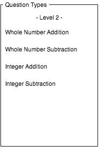 In this applet, questions are categorized by a combination of level (which determines the difficulty) and by types of problems listed. For more information on how questions are generated and what each level and problem type means, see Question Types for Arithmetic Quiz and Arithmetic Four.
