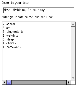 A pie chart uses percentages or fractions to compare the data. The whole is equal to 100%, which is the same as 1. So if you spend 7 hours at school and 55 minutes of that time is spent eating lunch then 13% of your school day is spent eating lunch. This can be figured by converting 7 hours to 420 minutes (you always must compare using the same unit of measure or your numbers are meaningless). Then solve the proportion 55 minutes / 420 minutes = ? % / 100% which works out to be about 13%.
