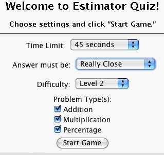 In this applet, questions are categorized by a combination of level (which determines the difficulty) and by types of problems listed. For more information on how questions are generated and what each level and problem type means, see Question Types for Estimator Quiz and Estimator Four.