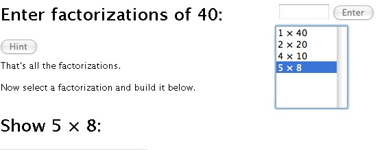 - Show students how to build the factorizations by dragging the mouse over the desired area