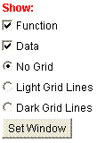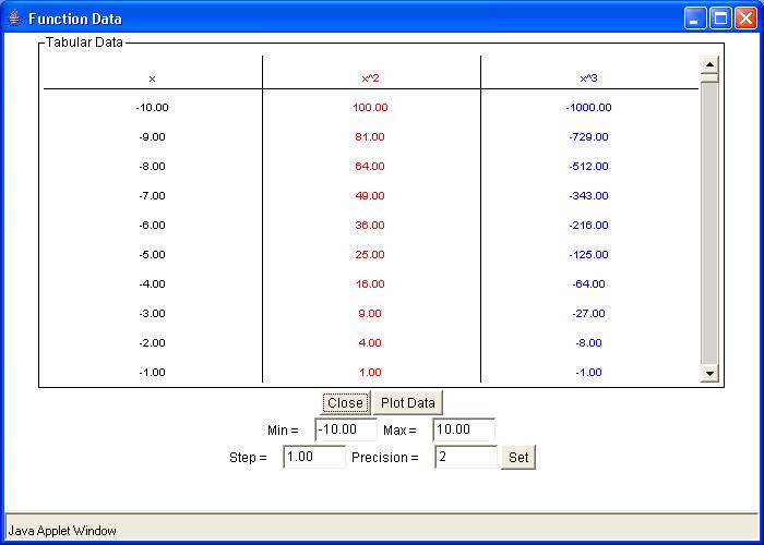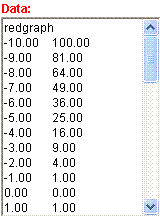x^(1/n) x^(1/3) cube root of x absolute value abs(...) abs(3 - x) absolute value of three minus x e to the power of x exp(...) exp(x) e to the power of x sine sin(...) sin(x**2) sine of x squared cosine cos(...) cos(5 - x) cosine of five minus x tangent tan(...) tan(x) tangent x arcsine asin(...) 2*asin(x) two times arcsine x arccosine acos(...) acos(x) arccosine x arctangent atan(...) atan(x) arctangent of x hyperbolic sine sinh(...) sinh(1 - x) hyperbolic sine of one minus x hyperbolic cosine cosh(...) cosh(10/x) hyperbolic cosine of ten divided by x hyperbolic tangent tanh(...) tanh(x) hyperbolic tangent of x natural logarithm ln(...) ln(x) natural logarithm of x base 10 logarithm log(...) log(x + 5) base ten logarithm of x plus five - The Data area is for entering data points. Data points should be in the form (x, y). Parentheses around the data point are optional. A tab or a space can separate the x and the y though no space is needed. A space or a carriage return is required to separate the data points from one another. After you input the coordinates, you must press the Plot/Update button to graph them.