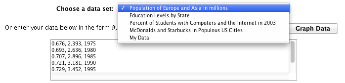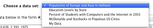 The user may choose from a set of pre-made data sets about daily activity, coin tosses, government spending, and more. The choice menu shown below has the pre-made data sets.