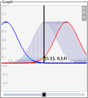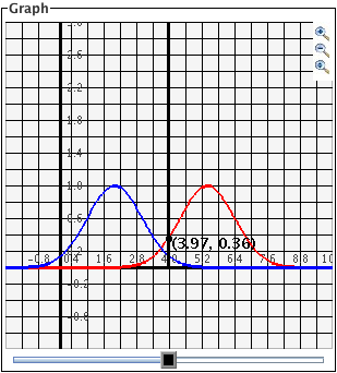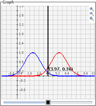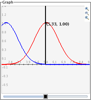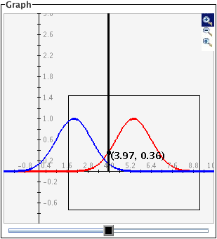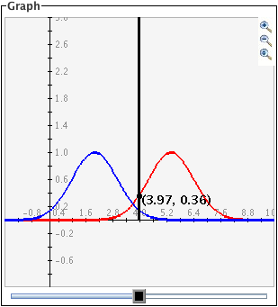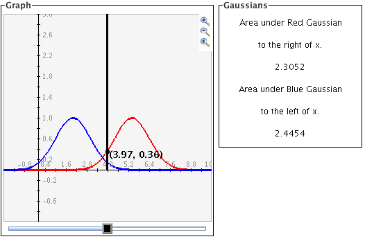 The black slider bar sets a bound for integrals of the two Gaussian curves. For the red
