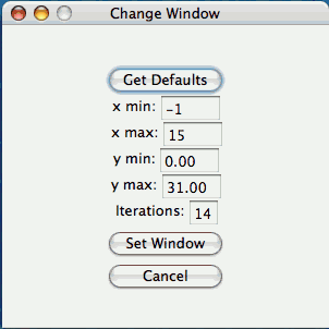 Preferences button and entering new values for the x max, x min, y max, y min, or iterations.