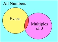 See how the circles overlap but not completely -- why? Because 6 is both even and a multiple of 3, but there are many numbers that are even and not multiples of 3 and vice versa. Numbers which are in both sets would be located in the little red sliver where the circles overlap.