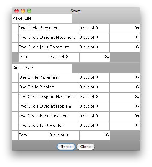 This activity will automatically record how successful you are at placing shapes in the venn diagram and guessing the rules of the venn diagram. To view the score, press the Show Score button at the bottom of the activity and a pop-up window will appear with the scoreboard.