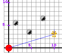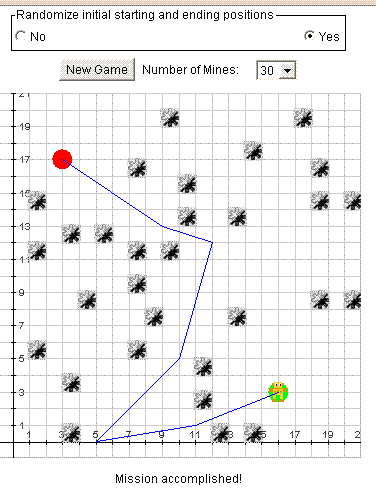 This game allows users to practice their point plotting skills by having them move a robot through a mine field to a target location. Moves are accomplished by specifying the coordinates of the new location. In order to win, the path must not cross a mine.