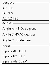 In order for the user to study the relationship involved in the Pythagorean Theorem, this applet draws a square against each side of the triangle. As the user adjusts the length of a side of the triangle, the squares adjust accordingly. Descriptive information about the length of each side, the measure of each angle, and the area of each square is provided on the applet.