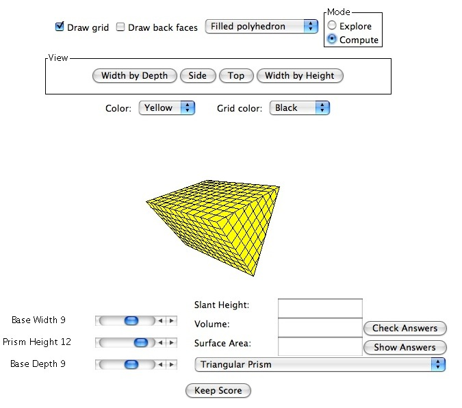 This activity allows the user to manipulate three-dimensional polyhedra to experiment with surface area and volume.