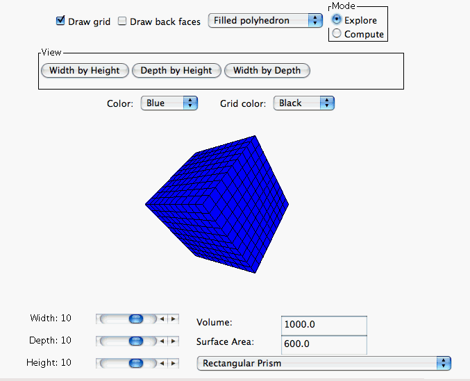 Explore Mode the computer automatically calculates and displays the surface area and volume of the