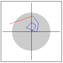 Here the points seem to be jumping around, getting farther away from (0,0) and finally leaving the gray circle of radius 2. We can try other starting points and look at what happens in each situation. There are three things that can happen. The points can: