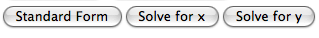 Once you have created an inequality relation, you can choose several ways to view the relation. By selecting the button "standard form" you will see the inequality written as you typed it in. For example: 2x + 3y LESS THAN 5. By selecting the button "solve for x" you will see the inequality written such that the inequality is solved in terms of x. For example, x LESS THAN -3/2y + 5/2. By selecting the button "solve for y" you will see the inequality written such that the inequality is solved in terms of y. For example, y LESS THAN -2/3x + 5/3.