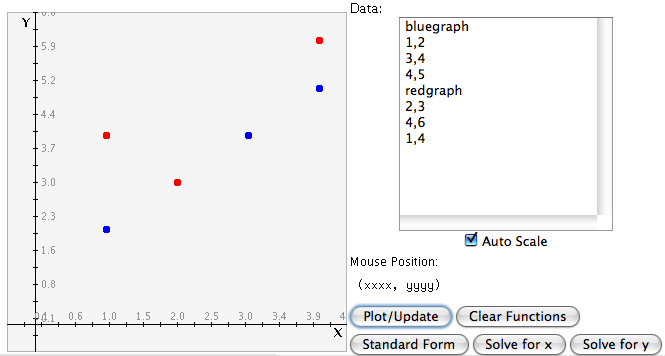 You can plot a total of four relations and infinitely many data sets at once. Separate data sets by typing newgraph or by writing each data set on a line by itself in the Data window. If you want to specify your own colors for the graphs you can replace newgraph with the following keywords: bluegraph, redgraph, greengraph, darkbluegraph, graygraph, magentagraph, purplegraph, crimsongraph and then all of the values following that keyword will turn the corresponding color.