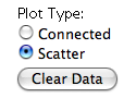 You can choose from two plot types. "Connected" draws a line from one point to the next (before the line is drawn the points are sorted by their x coordinates.) "Scatter Plot" just draws the points as dots on the graph. These options do not affect the way relations are graphed. By selecting "Clear Data" you can erase all data sets, while keeping values in the functions section.