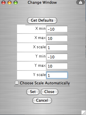 The Set Window button brings up a separate window where you can determine how the coordinate plane will appear on your screen. X min and X max are the minimum and maximum x-values displayed on the graph. Similarly for Y min and Y max. X scale is the distance between vertical gridlines. Y scale is the distance between horizontal gridlines. If the Choose Scale Automatically box is checked, the applet will choose appropriate values for you to display all your data. If you uncheck that box, you override the auto scale values with your own. Any changes you make to the window parameters will take effect once you select the Set button.