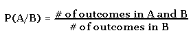 Mentor: Mathematicians would say that our question is about conditional probability, because it asks: "What is the probability of Event A on condition of Event B? That is the same thing as "in the case of Event B." There even exists a special sign for just that kind of probability (when people invent something new, they often invent notation to go with it; you can make up your own notation when you invent something). Recall that instead of writing "the probability of Event A" we can simply write P(A). Well, instead of writing: " The probability of Event A on condition of Event B" people write: