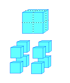 Notice that we can get 8 "self-similar" cubes out of the original cube at this scale factor. So: Dimension = 3, Scale = 2, and Number of self-similar objects = 8.