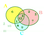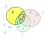 Mentor: Let us consider one more game as an example. In this game, four players share a twelve-sided die. Player A (Anton) wins if the die shows 1, 4, 6, or 12. Player B (Boris) wins if the die shows 2, 3, 4, 7 or 12. Player C (Chris) wins if the die shows 1, 4, 8, 9, or 12. Player D (Dorothy) wins if none of the other players win. I will describe several events to demonstrate how convenient the diagrams can be. First try to find the probabilities without looking at the diagrams: this way you will see which of them are hard to find without the diagrams. Find the probabilities of the events listed in the table. The corresponding diagrams and the answers are also in the table. Instead of writing: "The probability of Event A is .33" we can write simply P(A)=.33 The answers follow from counting the outcomes, out of twelve total.