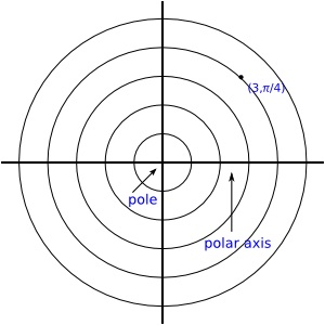 Mentor: The polar coordinate system has axes similar to the Cartesian system and a point like the origin except that it is called the pole. It also has a ray that extends horizontally through the pole called the polar axis. Instead of a square grid, there are concentric circles centered at the pole that get uniformly bigger and radiate out from the pole. Polar coordinate plane looks like this: