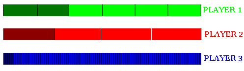 Student: So it makes sense to look at the "grand total" as a box that has the same length for each player, but a different number of "compartments"! It does not matter how the players choose the numbers, the meaning is the same. Now I can see how five winning outcomes for Player 3 mean much less chance than one winning outcome for Player 2!