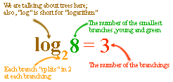 Mentor: Here is a riddle for you. If we have a full binary tree (no branches are cut off) that has 8 smallest branches, how many "levels of branching in two" are there? In other words, if we were playing with coins, how many coins would you need to produce 8 outcomes?