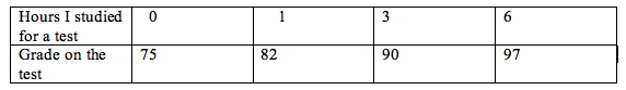 Student: Well, maybe you could make a table with two rows. On the top row you could record the number of hours studied and on the bottom row the grades that you received, like this: